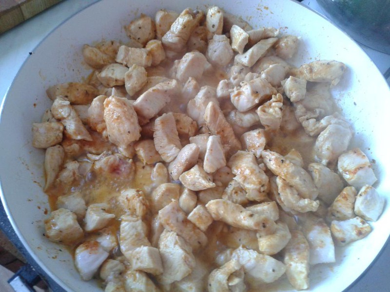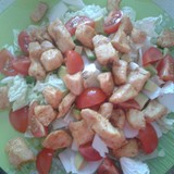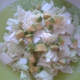 ķīnas kāposts(bet var arī izmantot jebukurus lapu salātus), mīksts avokado, ķiršu tomāti, gurķis, vistas fileja.